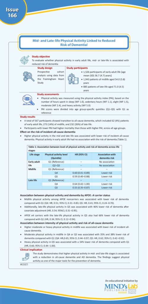 A recent study published in JAMA Neurology by Marino FR et al., was based on the data from Framingham Heart study and evaluated the associateion between self-reported physical activity in adult life and the risk of dementia. Higher levels of physical activity during midlife and late life were associated with lower risk of all-cause dementia and AD dementia. These findings highlight the need to promote physical activity during midlife or late life to delay or prevent dementia (see the Graphic for the study snapshot).