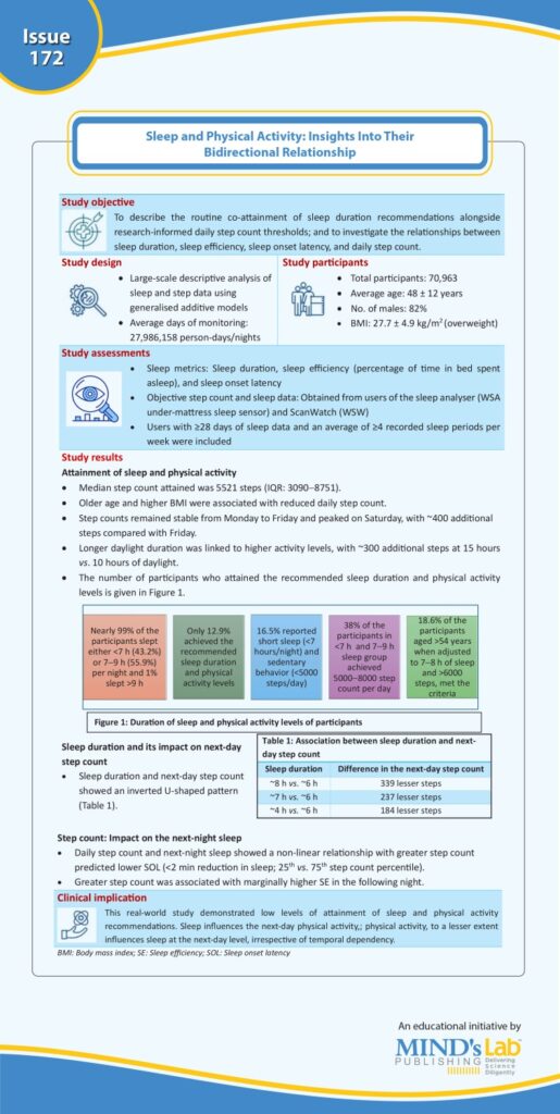A recent study by Fitton et al., demonstrated that only 12.9% of the people achieve the recommended sleep duration of 7–9 hours per night and >8000 steps per day, with 16.5% having short sleep (<7 hours per night) and sedentary lives (<5000 steps per day). Sleep efficiency predicts next-day step count in a dose-dependent manner. The findings highlight the need to ensure adequate sleep and activity recommendations for good health, and that this is mutually attainable (See graphic for details).