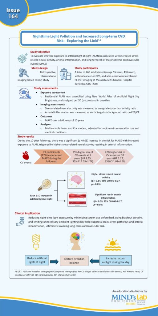 (Sources: (1.) Saeed F, Aldosoky W, Kim H, et al. Nighttime light pollution associates with adverse cardiovascular events via a mechanism involving heightened stress-related neural activity and atherosclerotic inflammation. Poster presented at the American Heart Association Scientific Sessions 202, November 7–10, 2025, New Orleans, Louisiana, USA. Poster abstract no. MP2275 — 2025. (2.) Hughes S. Artificial light at night may raise CVD risk, Medscape, 2025 [Internet]. Available from: https://www.medscape.com/viewarticle/artificial-light-night-may-raise-cvd-risk-2025a1000uz6