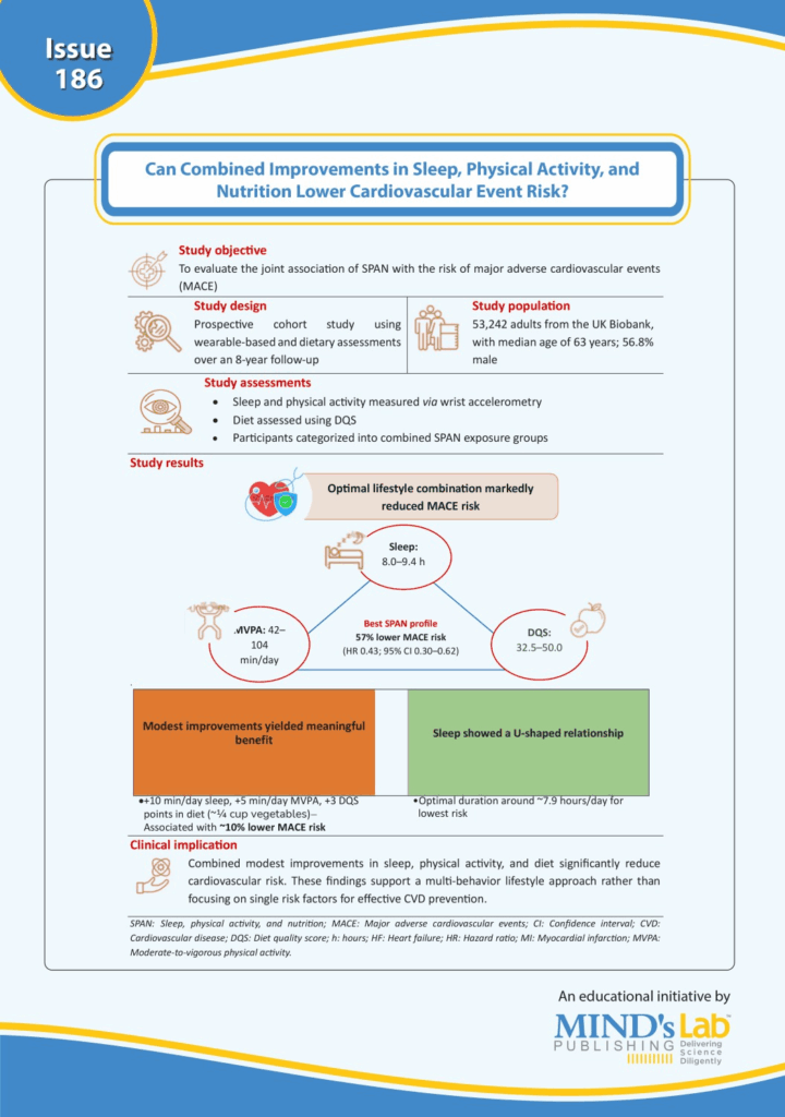A large prospective cohort study involving 53,242 participants studied the combined impact of SPAN i.e., Sleep, Physical Activity (both assessed using wearables) and Nutrition (using self-reported questionnaire) on cardiovascular outcomes. Even modest improvements across these SPAN behaviors can substantially reduce cardiovascular risk, highlighting the importance of integrated lifestyle strategies.