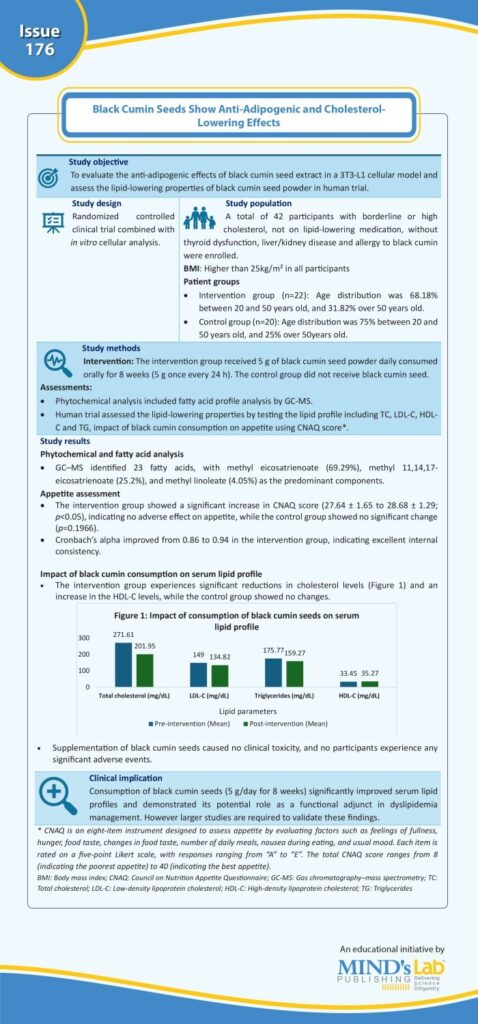 Source: Ahmed S, Ali MS, Nishigaki Y, Das R, Shiblu SA, Akter S, Matsui-Yuasa I, Kojima-Yuasa A. Black cumin seed (Nigella sativa) confers anti-adipogenic effects in 3T3-L1 cellular model and lipid-lowering properties in human subjects. Food Sci Nutr. 2025;13(9):e70888. Doi: 10.1002/fsn3.70888.