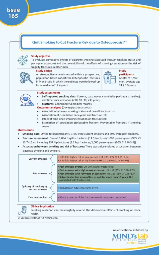 Sources: 1. Xu Y, Bao Y, Wang M, Wu Q. Smoking and fracture risk in men: A meta-analysis of cohort studies, using both frequentist and Bayesian approaches. Sci Rep. 2022;12(1):9270. Doi:10.1038/s41598-022-13356-1; 2. Tarantino U, Cariati I, Greggi C, et al. Skeletal system biology and smoke damage: From basic science to medical clinic. International Journal of Molecular Sciences. 2021; 22(12):6629. https://doi.org/10.3390/ijms22126629; 3. Osteoporotic Fractures in Men Study. Cigarette smoking and reversible fracture risk: cumulative and cessation effects [Internet]. ASBMR Annual Meeting Abstracts; 2025. Available from: https://asbmr.confex.com/asbmr/2025/meetingapp.cgi/Paper/4468; 4. Kling J. Quitting smoking may reduce risk for fractures [Internet]. Medscape; 2025. Available from: https://www.medscape.com/viewarticle/quitting-smoking-may-reduce-risk-fractures-2025a1000oka.